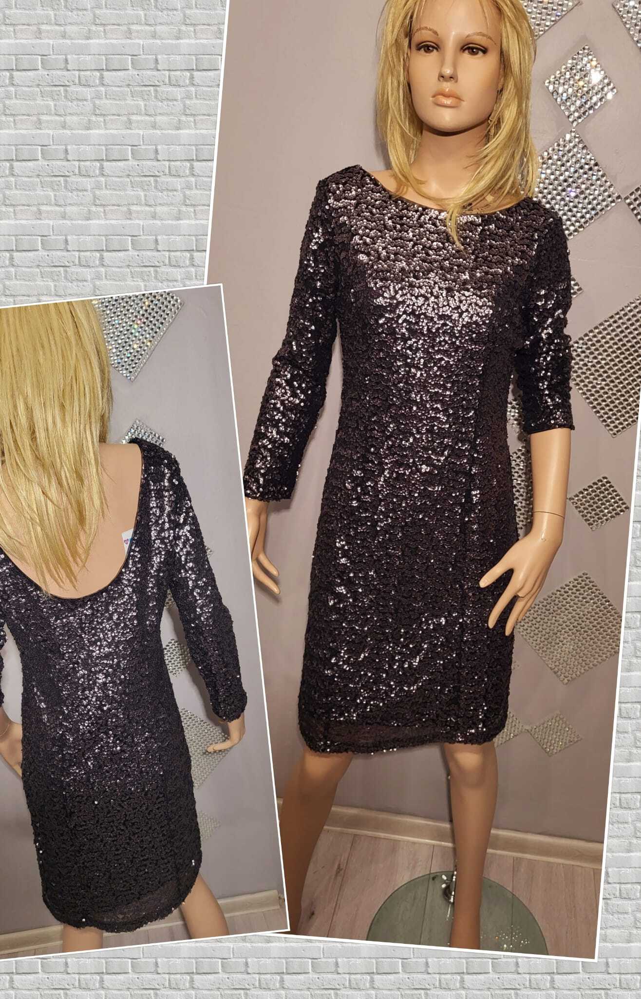 Ta olśniewająca czarna sukienka z cekinami to synonim nocnego blasku i elegancji. Idealna na specjalne okazje, ta sukienka z długimi rękawami dodaje odrobiny romantyzmu do każdej stylizacji. Z przodu prezentuje klasyczny, okrągły dekolt, podczas gdy tył zaskakuje subtelnym, niskim wycięciem, oferującym dyskretny pokaz pleców.
